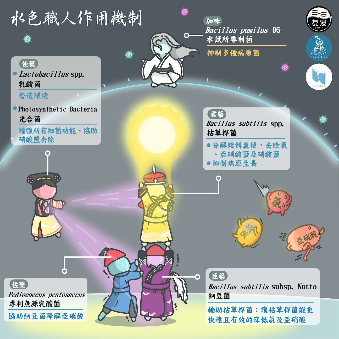主要成分:Bacillus subtilis var. natto、Bacillus pumilus D5、Bacillus subtilis sp.、Lactobacillus spp.、Photosynthetic Bacteria、Maltodextrin、Diatomaceous earth (每克超過60億株菌)