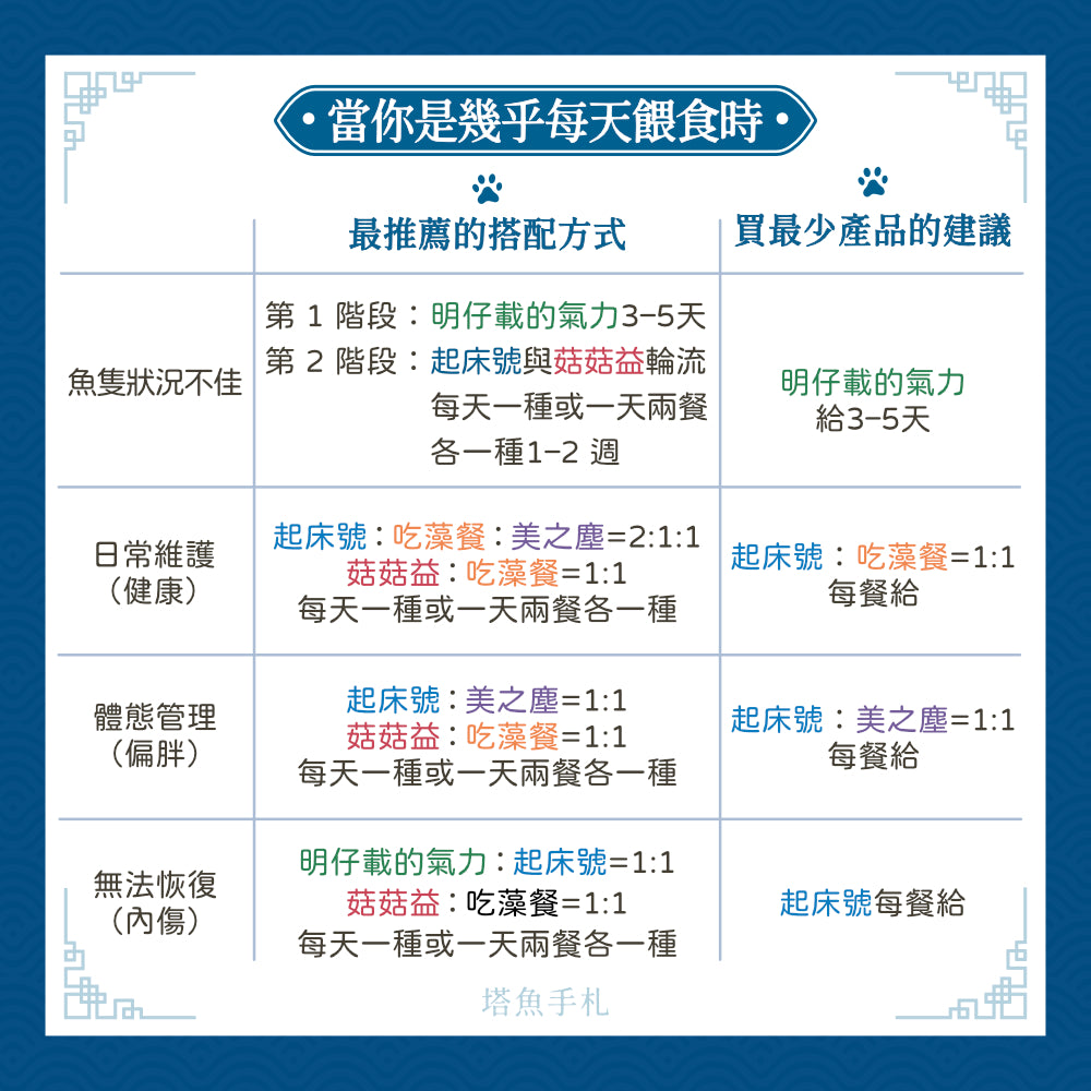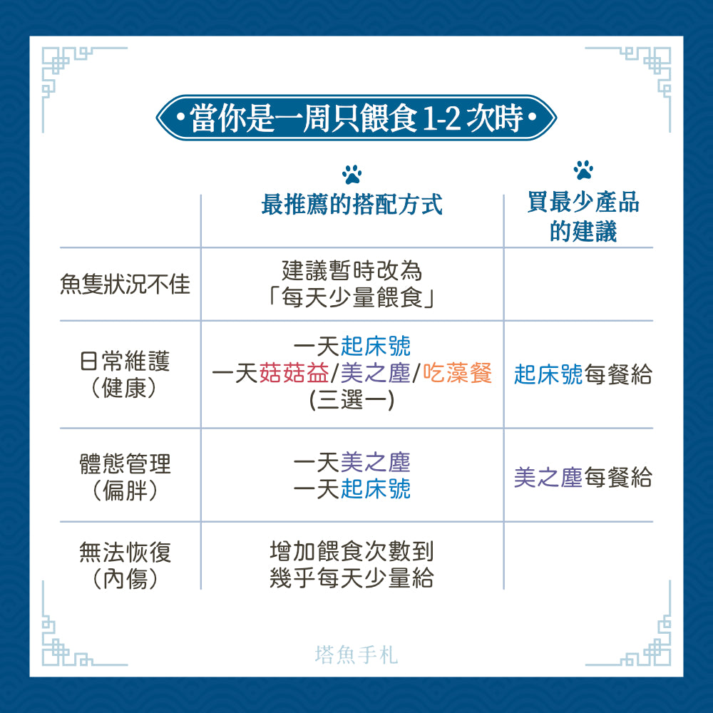 - 魚況穩定時:與吃藻餐 1:1 ,或者是起床號:吃藻餐:美之塵 = 2:1:1 混用,每 1–2 天補一次。若一週只用 1–2 次,直接用原粉。。