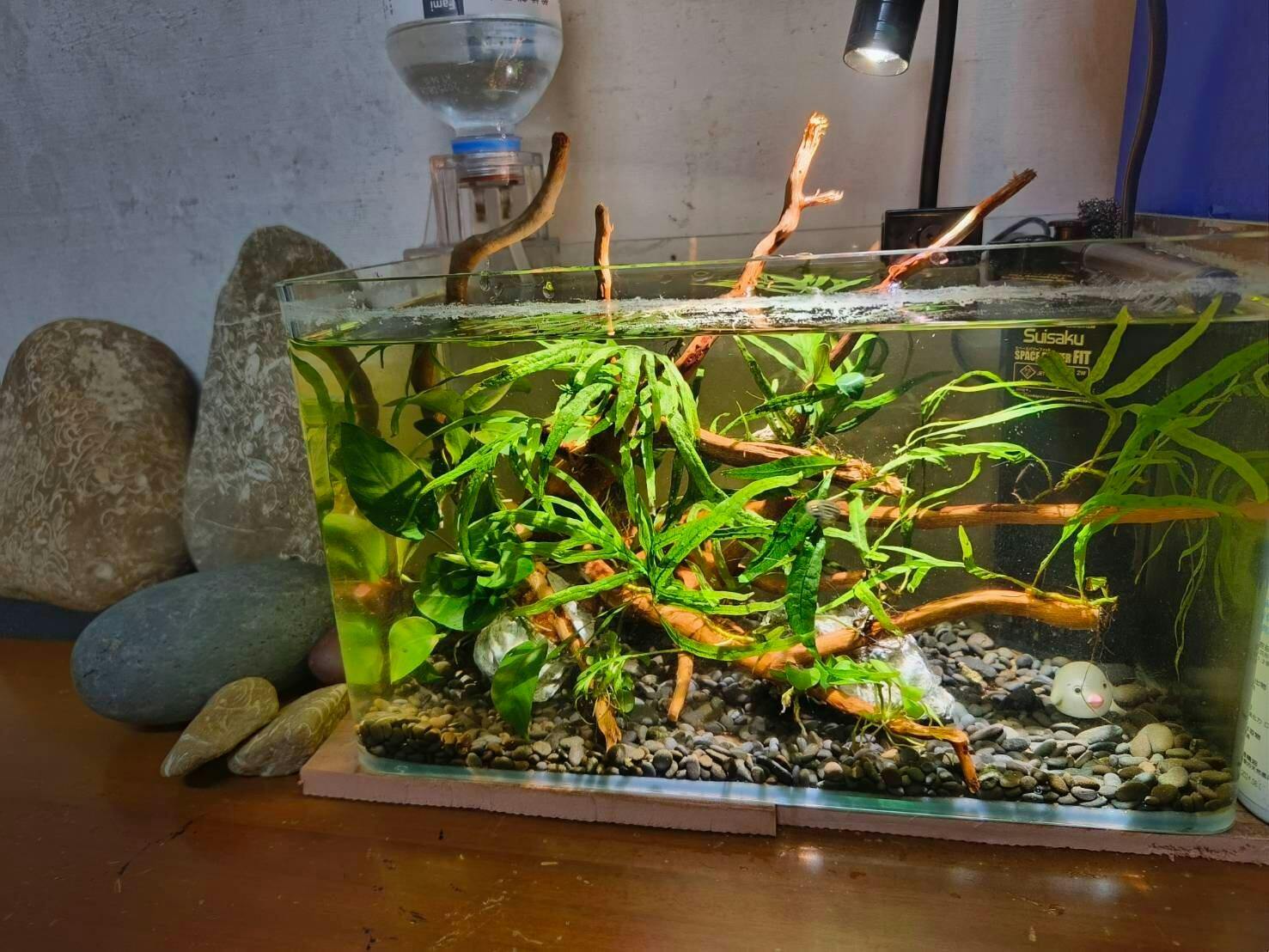 水草也是生物。需要另外花心思下去照顧、觀察。如果沒有把握的話,純粹硬景,或者是假水草也是一種選擇。