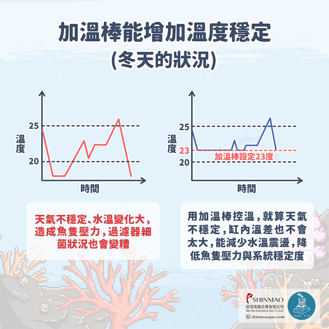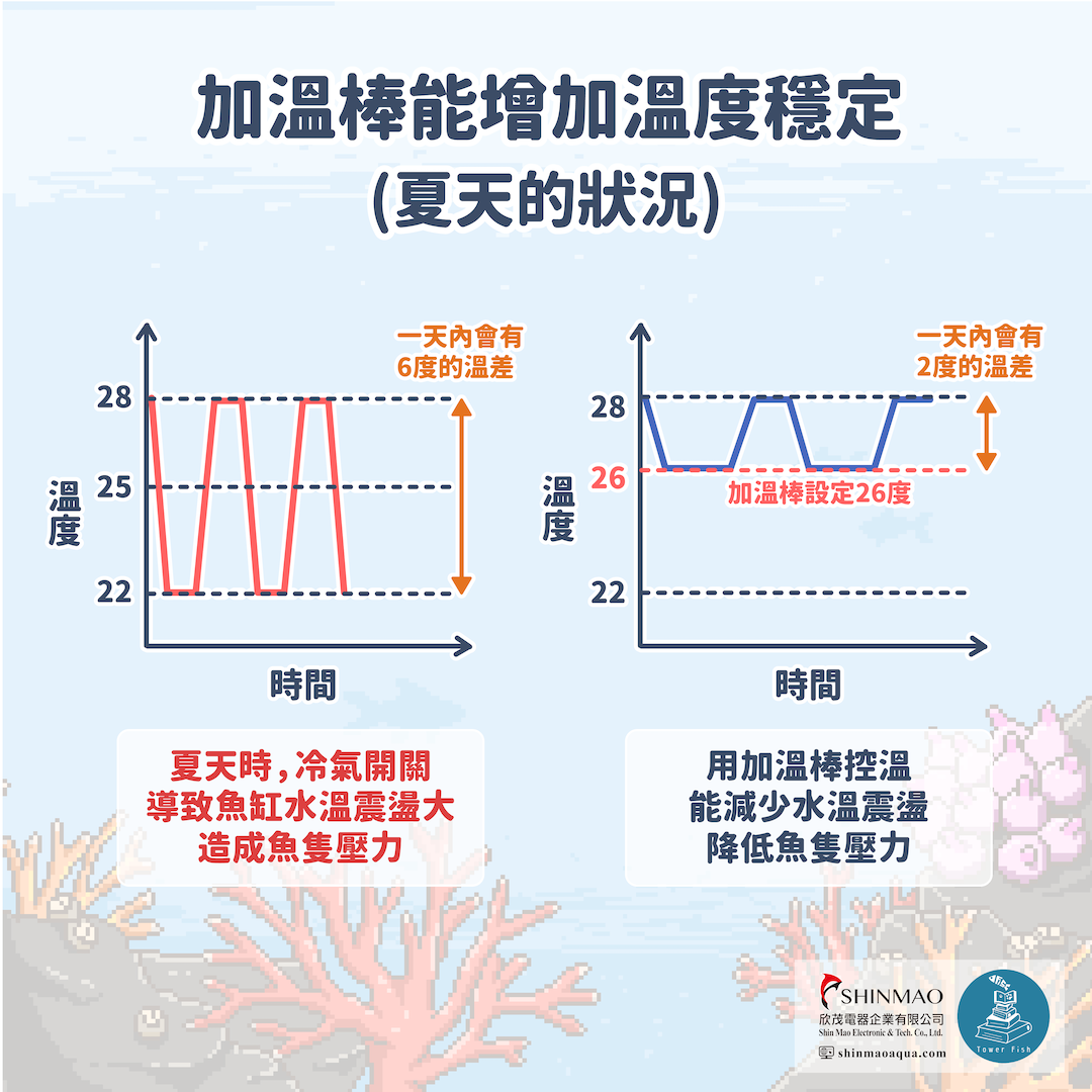 不論是主缸本身的震盪,或是換水時候溫差,都可以透過加溫棒減少溫度震盪。減少魚隻壓力。
