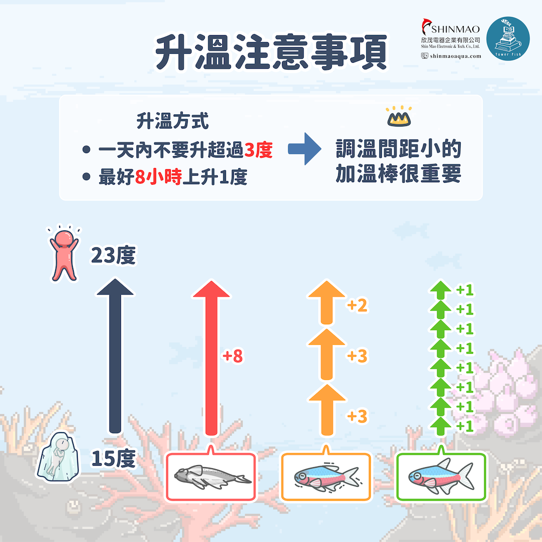 升溫一定要慢慢來!不要貪快!否則可能造成魚隻死亡。