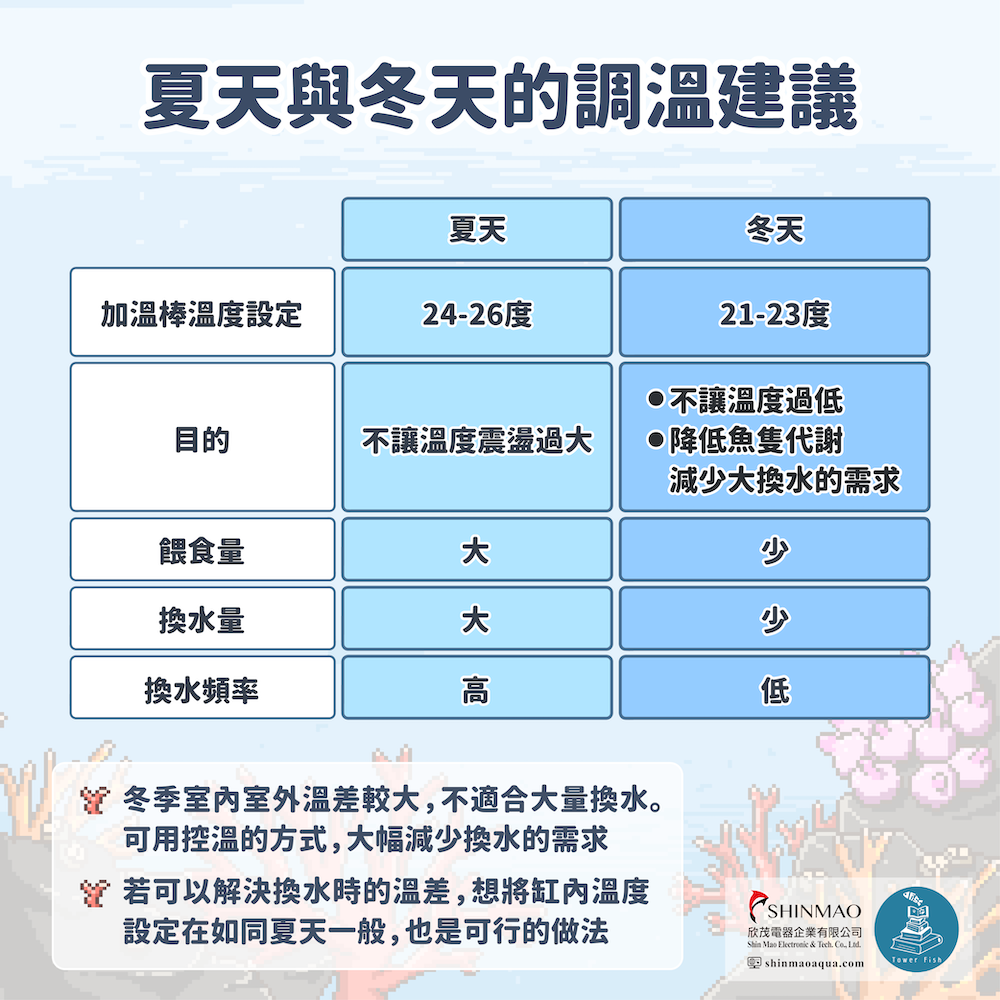 夏天和冬天水溫設定不一定要相同。但照養方式需要隨著溫度調整。而不論怎麼設定,都要把握減少水溫震盪的原則。