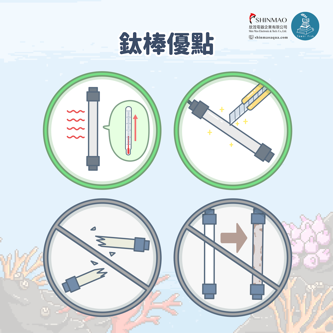 塔魚所進的欣茂加溫棒都是鈦合金加溫棒。跟傳統加溫棒比起來鈦合金棒具有以下優點