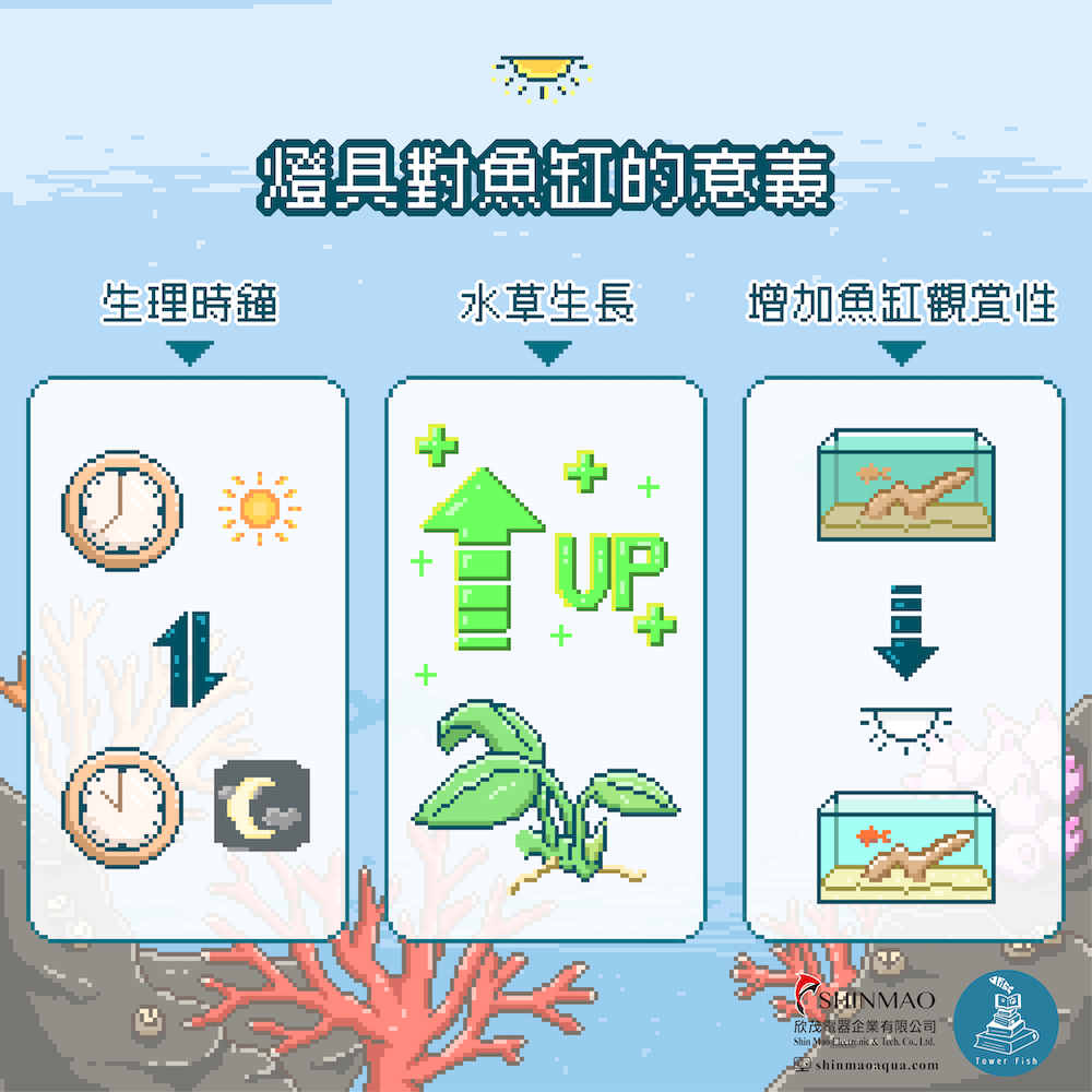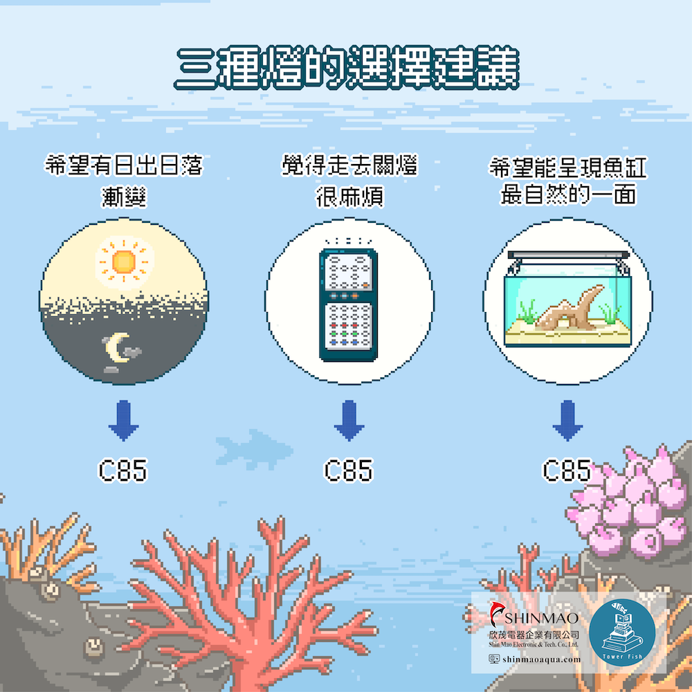 - 魚缸放置處平常都沒人在,需要定時開關,讓魚有正常生理週期。