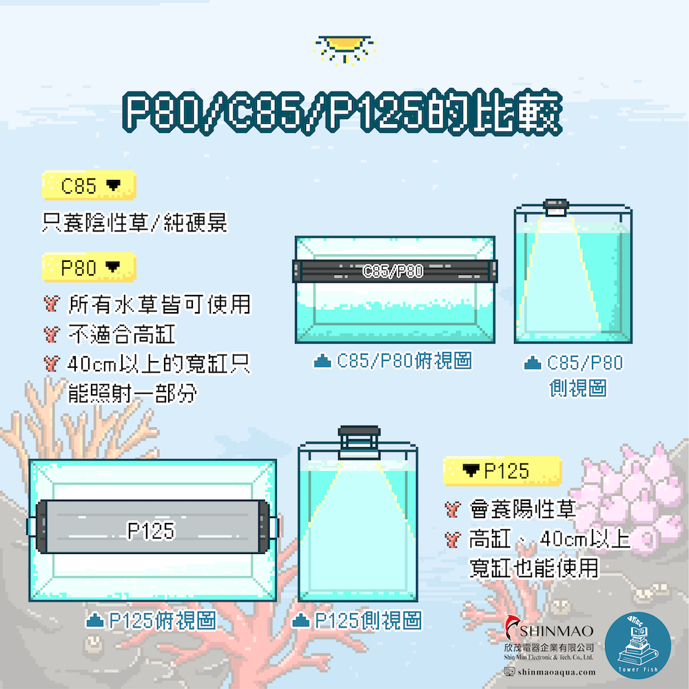 P125的光照範圍與強度都比P80大。更適合陽性水草缸。或是較寬較深的魚缸。
